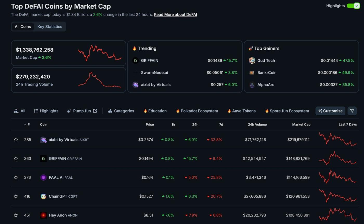 The DeFAI category on CoinGecko is even more modest at $1.3b.