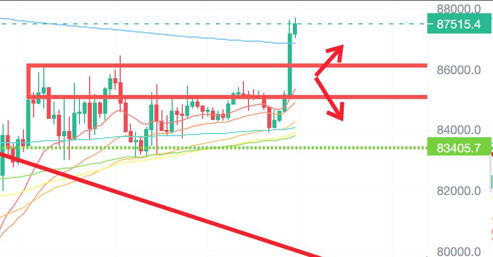 On April 21st, BTC trading strategy and intraday analysis: Looking at the 4-hour chart, Bitcoin has finally broken through the horizontal range of the past week, showing a clear breakthrough signal! The long-awaited breakthrough signal is clear and reliable, and can be followed for entry! Do not rashly chase at the resistance level. Intraday trading plan: BTC 1. Pay attention to the resistance near 87500-88000, chase if breakthrough. 2. Pay attention to support near 85500-86000, stop loss and go long.