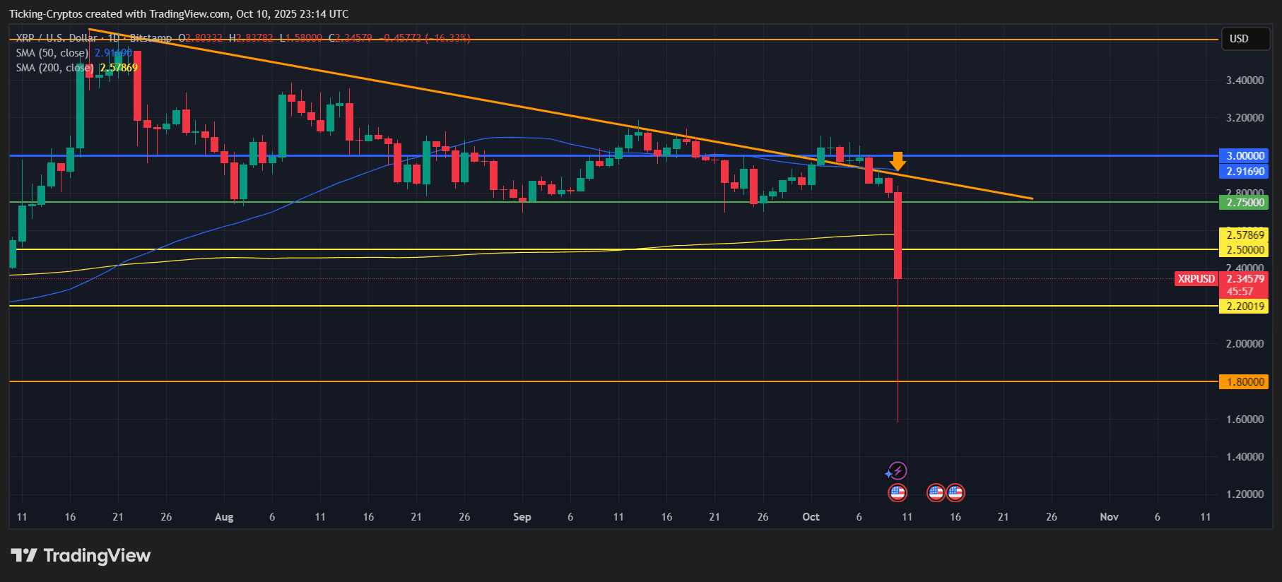 As shown in the above chart, XRP just suffered a technical breakdown after losing the crucial support zone near $2.75 and plunging below both the 50-day SMA ($2.91) and 200-day SMA ($2.57).