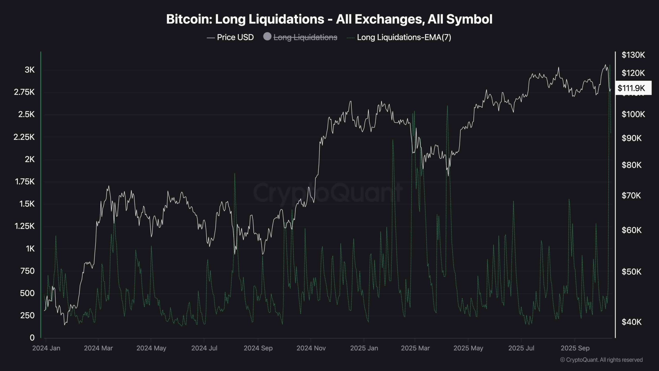 The liquidation chart highlights a massive spike in long liquidations, the largest one ever, coinciding with Bitcoin’s failure to set a new high. This cascade has forced overleveraged traders out of the market and significantly reduced open interest.