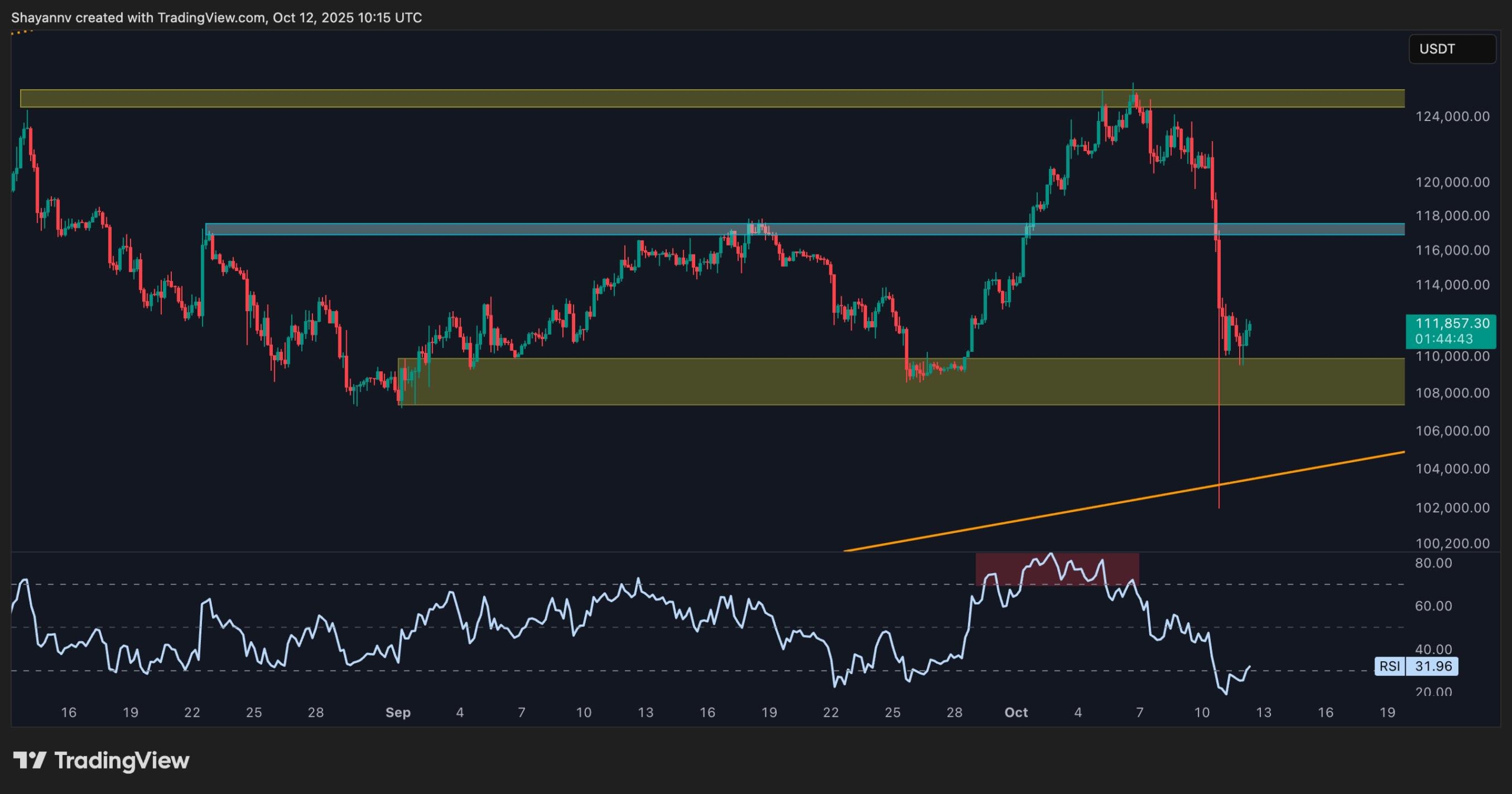 The 4-hour chart shows that BTC found temporary support around the $110K zone after the intense sell-off. This area previously served as an accumulation zone before the last leg up, making it a critical short-term level.