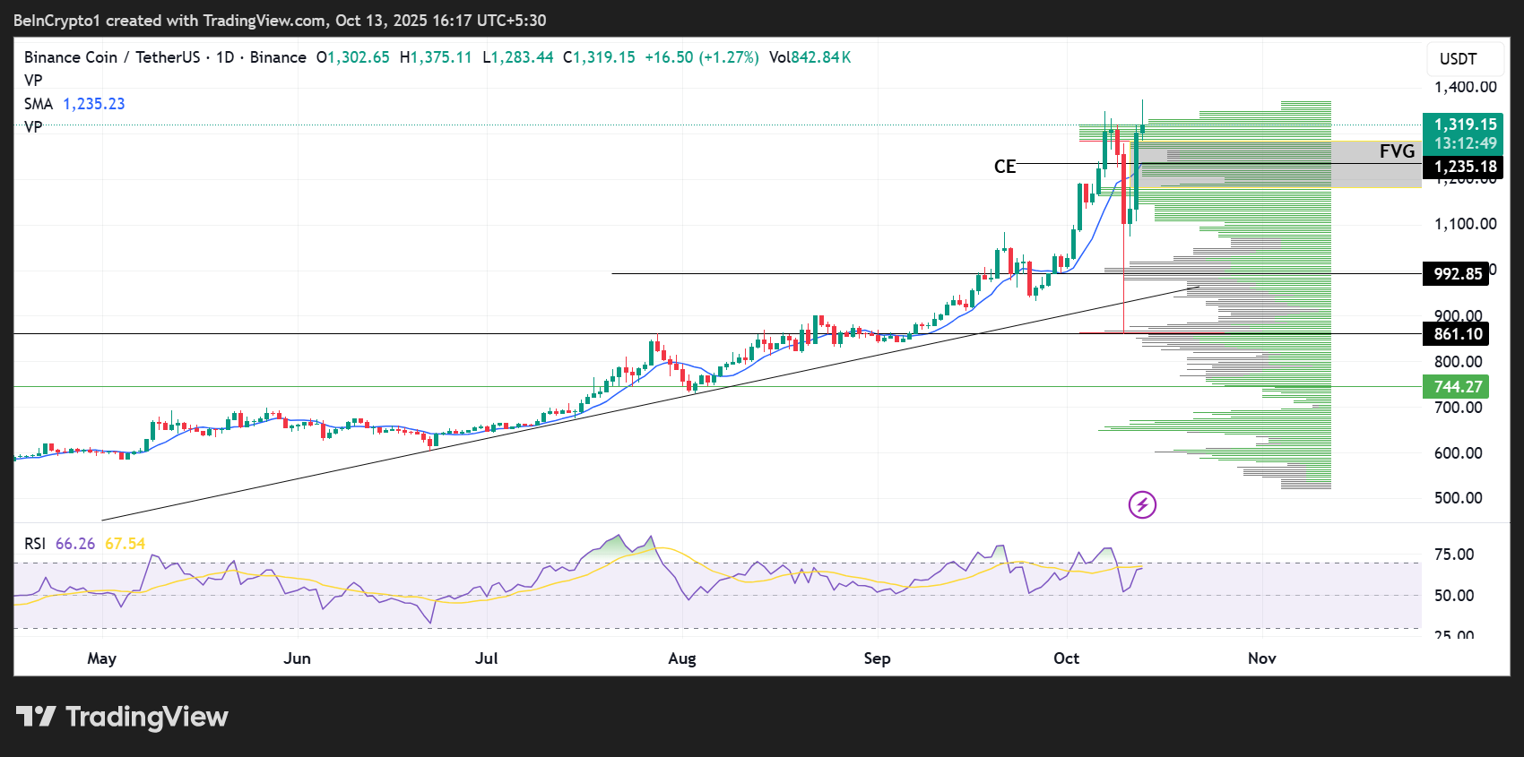 The Simple Moving Average (SMA) provides initial support at $1,235, with the RSI indicator showing rising momentum. With the RSI position at 66, there is still more room to the upside before BNB can be considered overbought.