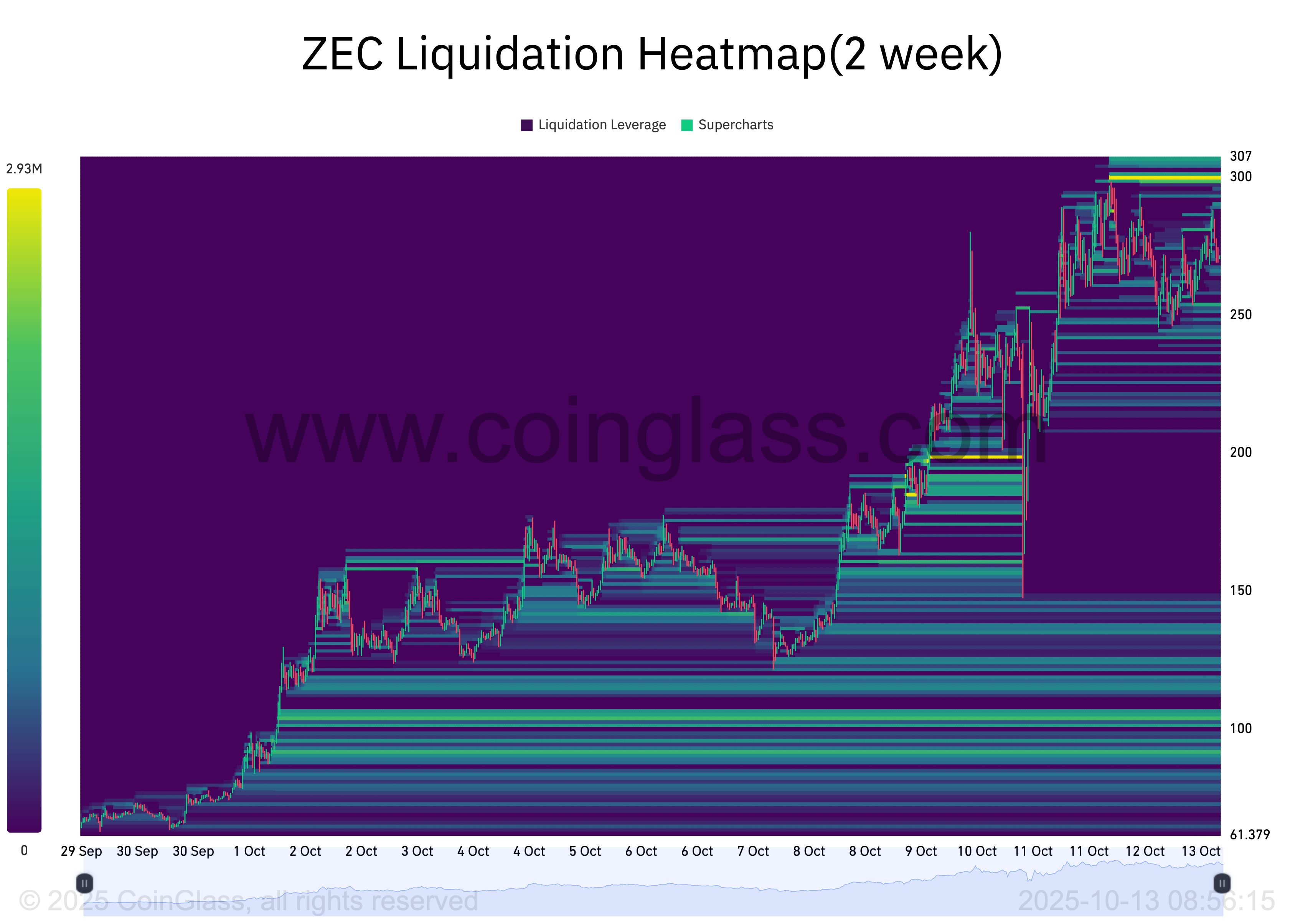 According to data from Coinglass, ZEC’s liquidation heatmap shows a dense capital cluster slightly above its current price level at $300.56.