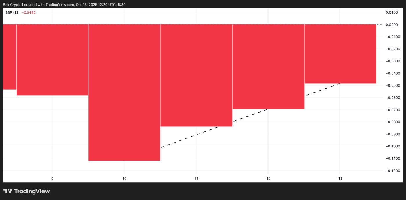 The Elder-Ray Index measures the strength of bulls and bears in the market. When it returns red histogram bars whose sizes begin to reduce, it indicates that bearish momentum is weakening and buyers are gradually regaining control.