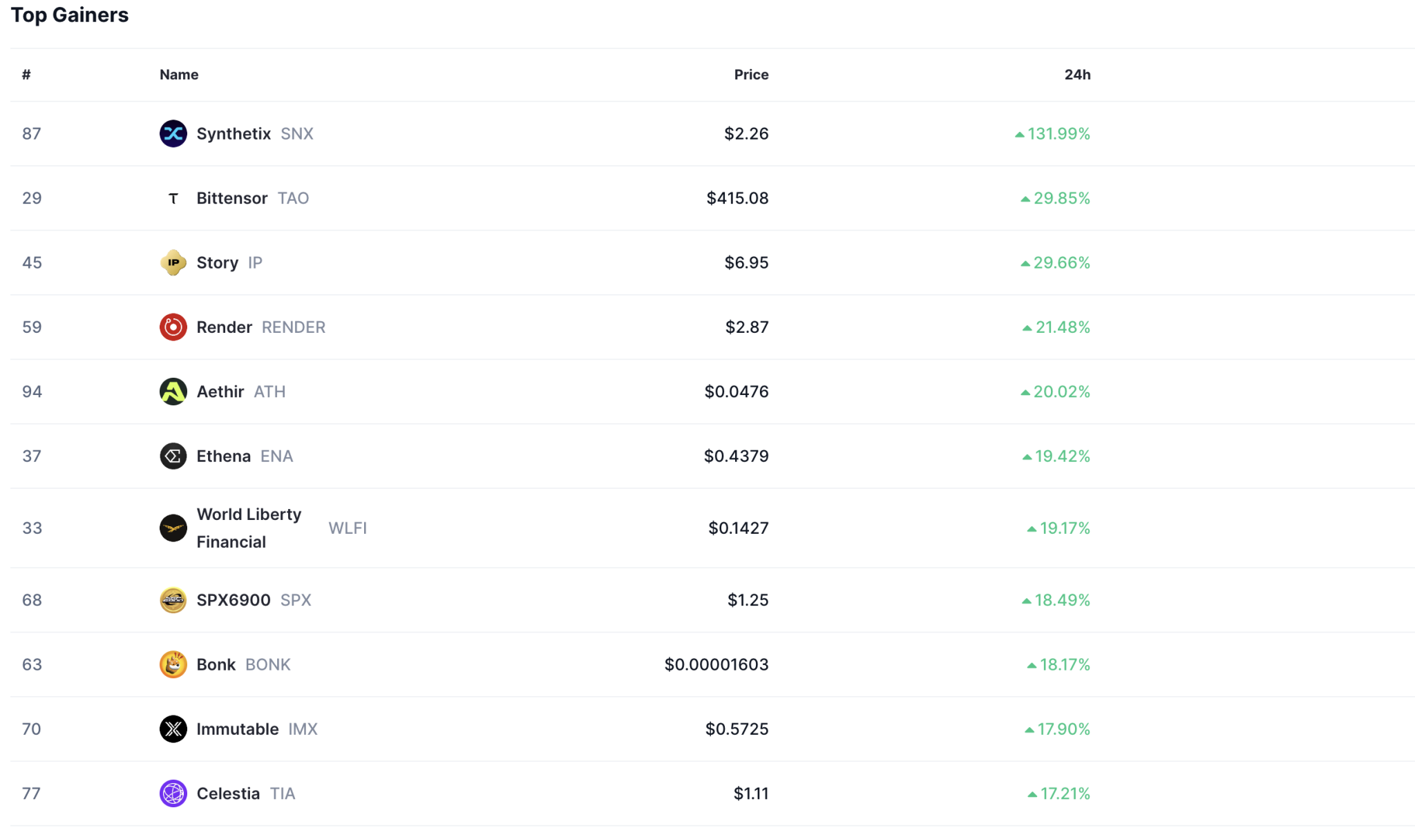 According to CoinMarketCap data, SNX topped the list with a surge of more than 120% in the last 24 hours. Bittensor (TAO) followed with a 29.8% increase and Story (IP) with a 29.6% increase.