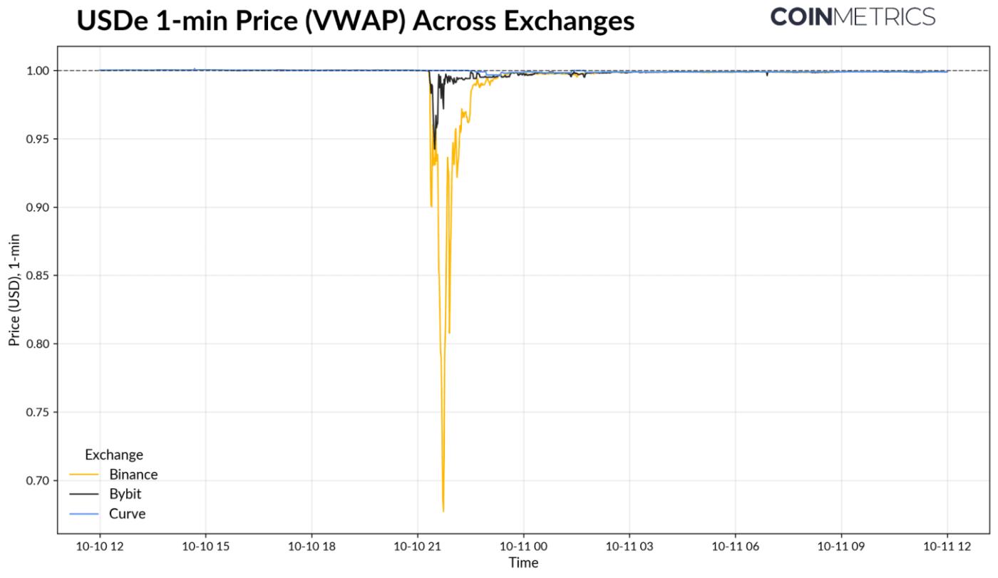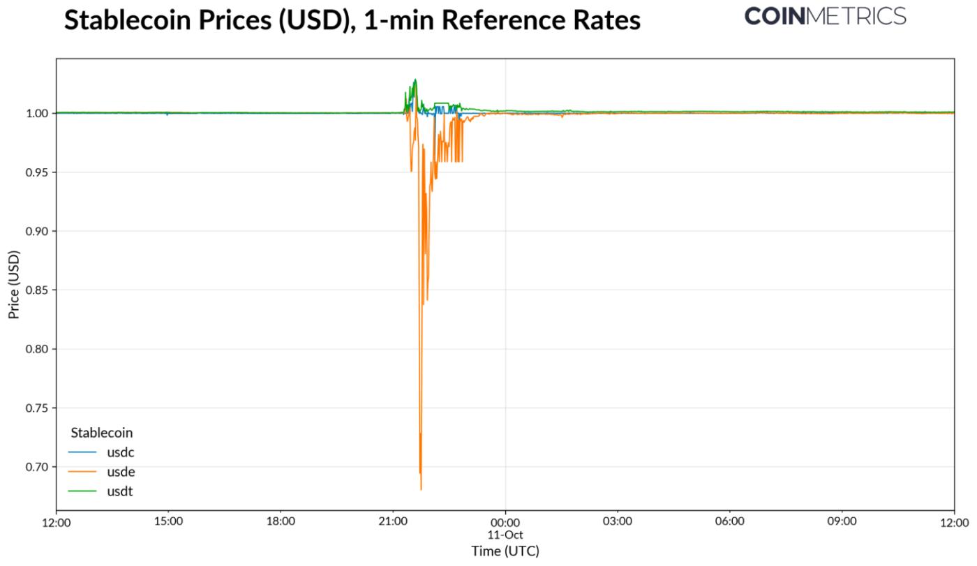 During the crash, USDe briefly fell to as low as $0.67, while fiat-backed stablecoins like USDT and USDC traded slightly above par.