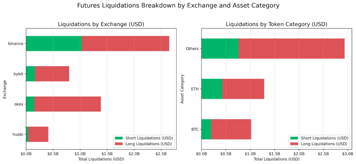 While the impact was felt across the board, the severity of the liquidations varied by venue and asset type. Altcoins accounted for the bulk of the wipeout, with open interest across non-BTC assets falling by more than 25%, compared to 15% for BTC and 24% for ETH between October 8th and October 10th. By venue, Binance, OKX and Bybit saw the largest liquidations, suggesting a higher share of leveraged activity with long liquidations dominating activity.
