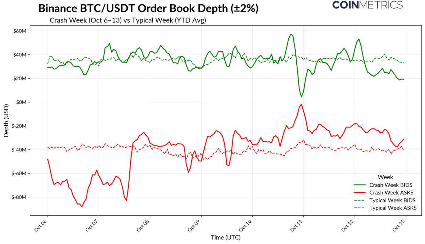 The violent liquidation cascade was further exacerbated by shallow market liquidity. This is observable in Binance’s BTC/USDT order book depth data. The chart below shows BTC/USDT depth within ±2% of the mid-price across crash week (Oct 6–13) versus the year-to-date (YTD) average.