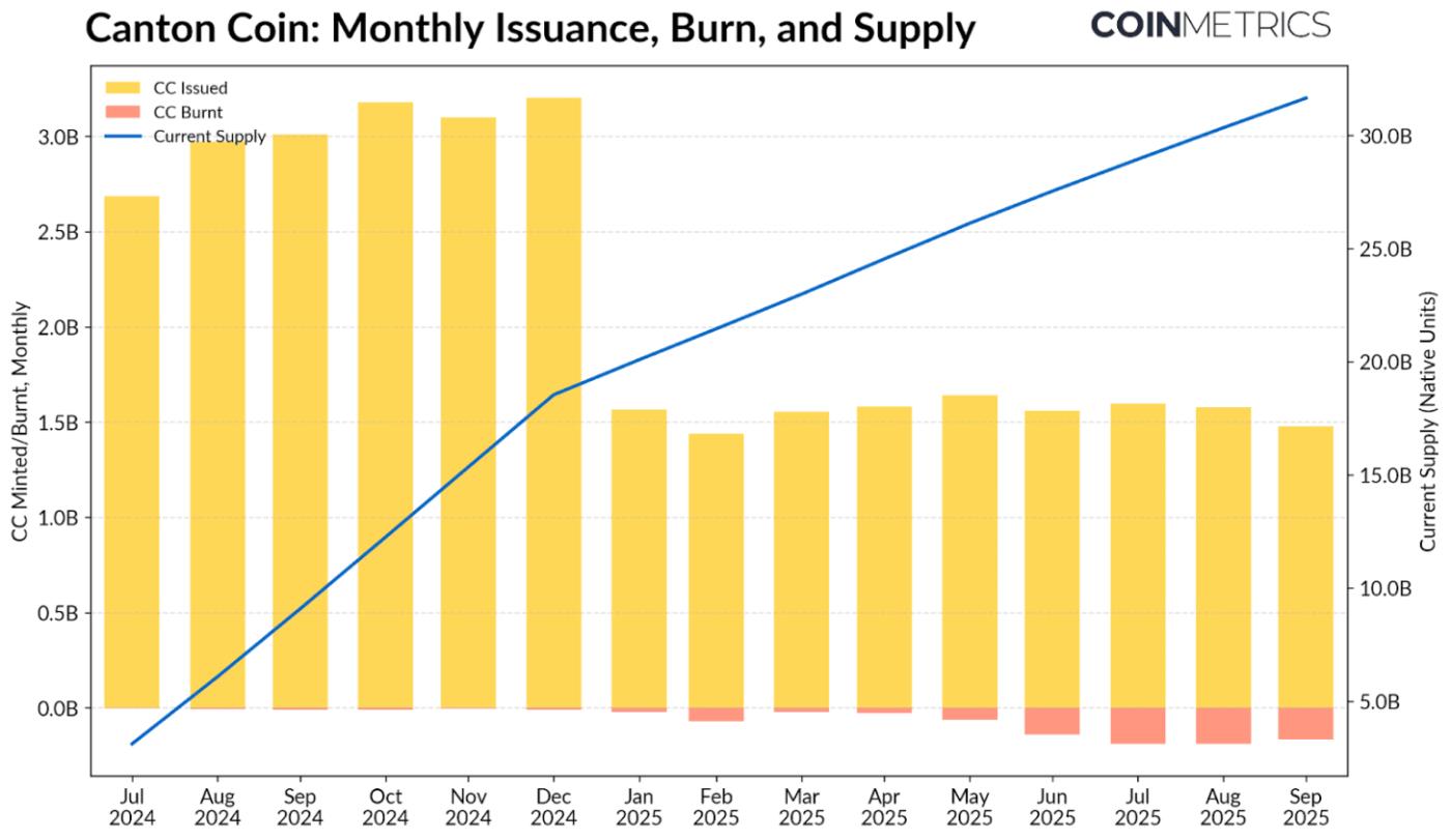 Canton Coin (CC) employs a mint-and-burn model that aligns economic incentives with network activity, rewarding participation while offsetting supply through usage-based burns. Over time, rewards evolve from infrastructure operators to application providers as the network matures.