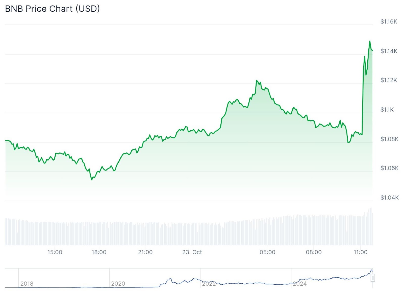 Thursday’s rally comes just 10 days after BNB reached a new all-time high of $1,369.99 on Oct. 13, despite the broader crypto market recording nearly a week of losses following a larger crash on Oct.10.