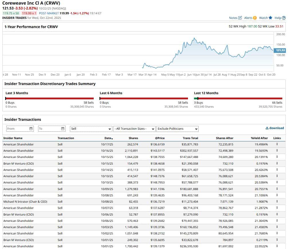 CoreWeave stock has already felt the pressure. Shares closed October 22 at $121.53, down nearly 3% on the day and well off the 52-week high of $187. Post-market trading pushed the stock below $120, hinting at further volatility as the market digests the insider activity.
