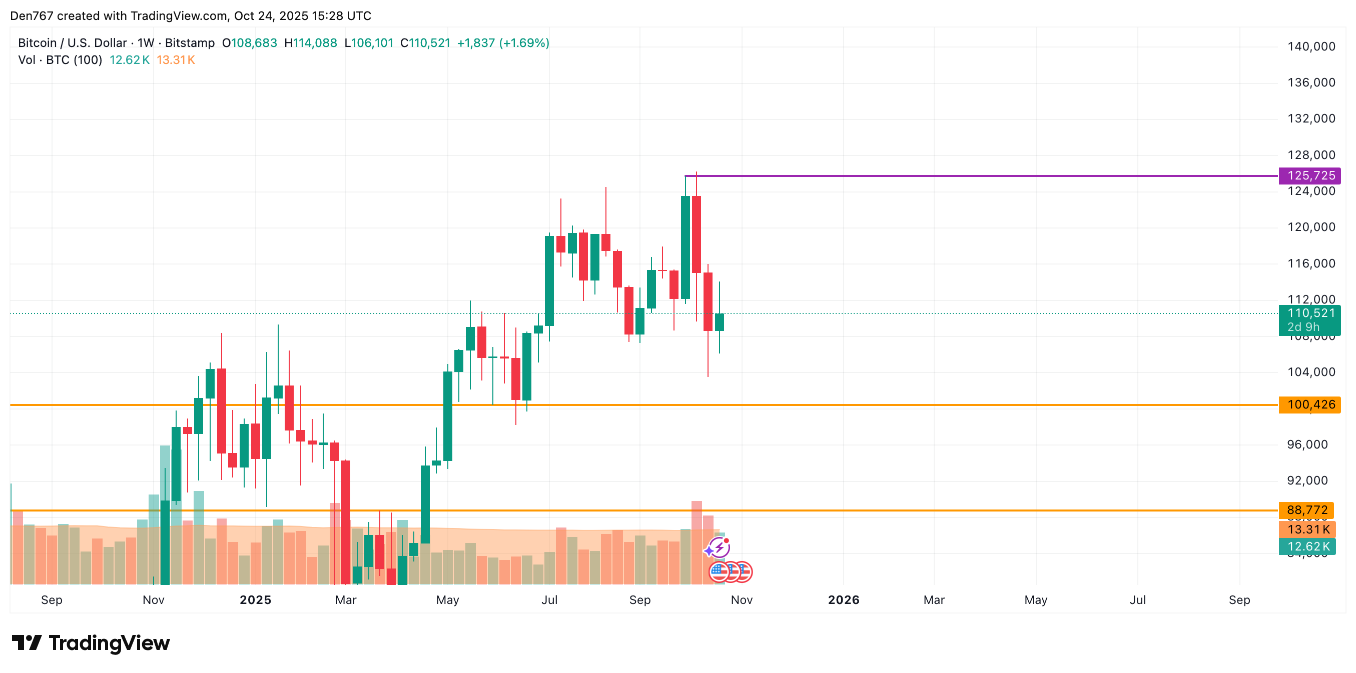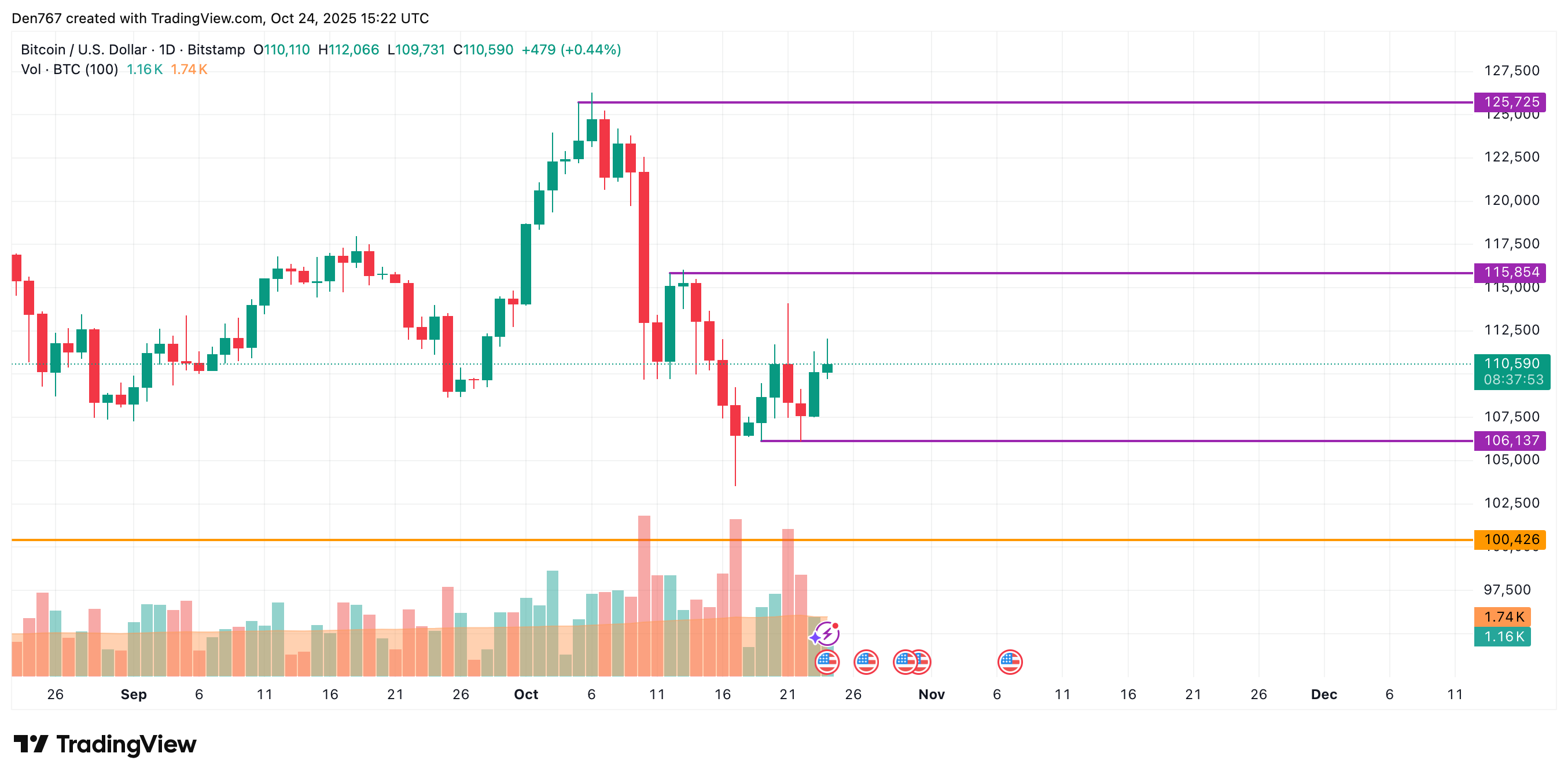 On the longer time frame, the price of the main crypto is in the middle of the channel, between the support of $106,137 and the resistance of $115,854.
