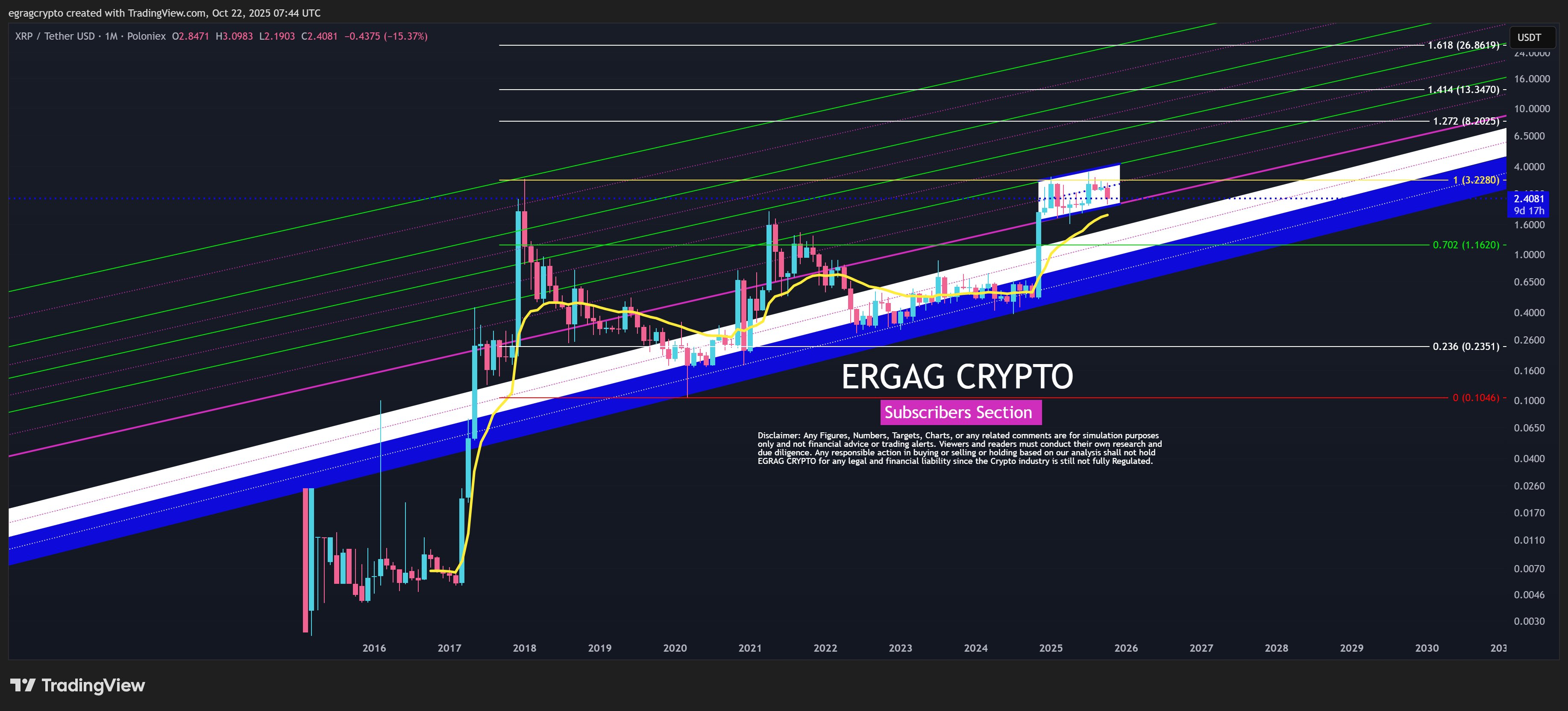 Beyond this, the next targets lie at $8.2, aligning with the 1.272 Fibonacci extension, $13.3 at Fib. 1.414, and $26.8 at Fib. 1.618. EGRAG has persistently predicted that XRP could rally to $26. Last October, the analyst identified this as the ultimate target using a standard deviation model.