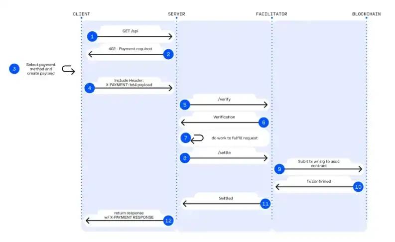 HTTP 402 is a network status code indicating "payment required," but it has long been rarely used in practice. The x402 protocol exploits this status code: when an AI agent sends an API request, the server returns an HTTP 402 status code with the message "payment required to continue." The AI agent recognizes this message and automatically pays the corresponding fee in stablecoins. The specific process is as follows: