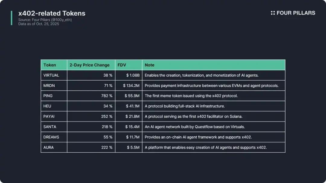 The most direct sign that x402 has entered a hype phase is the surge in the prices of related tokens. For example, $VIRTUAL, a token that tends to rise in tandem with the rise of the "AI agent" concept, saw a 40% increase in just two days. Other related tokens also saw significant increases, as shown in the chart below.