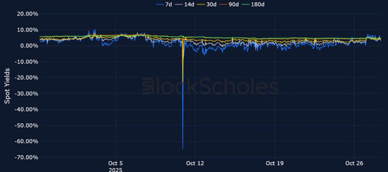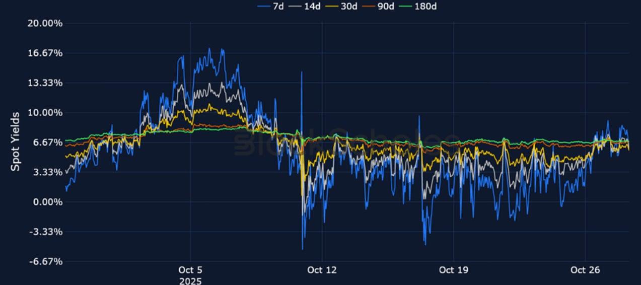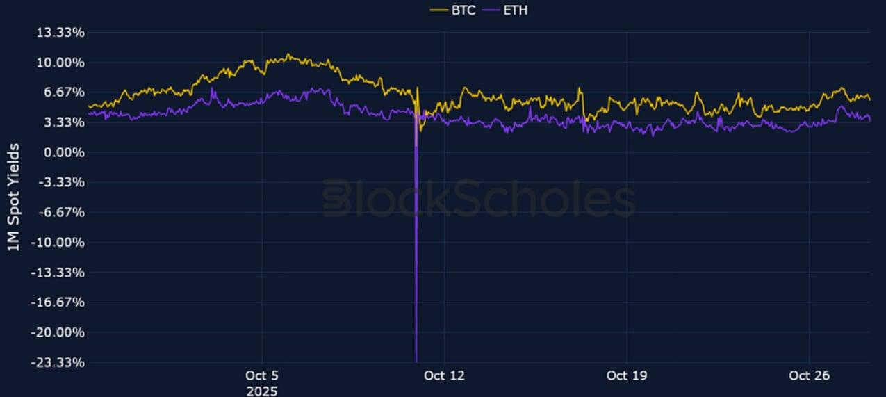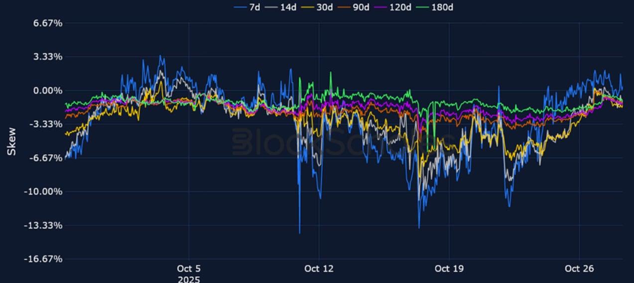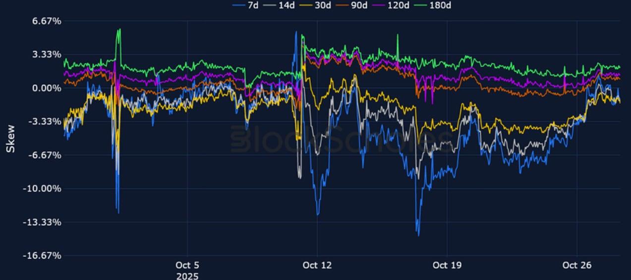 The past week has been characterised by a modest recovery in risk-on appetite as BTC and ETH trade 5% and 6% higher, respectively. That has encouraged a slight pick up in derivatives market, where sentiment is not excessively euphoric, though far less bearish than earlier in the month. BTC and ETH’s short-tenor volatility smile skew has steepened to the upside, with much of the bearish sentiment being priced out over the past week. ETH’s 7-day put-call skew still trades with a slight put bias, though skew for similar-dated BTC options is modestly positive. ATM implied volatility levels remain elevated relative to pre-October 10 levels, indicating continued demand for options exposure. The recent rebound in risk sentiment came amidst signs of reduced trade tensions between the two largest economies in the world – the US and China. Trade negotiators from both sides reached a preliminary consensus and “a very positive framework” for President Trump and President Xi to discuss in their Thursday face-to-face meeting later this week.