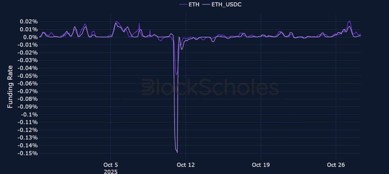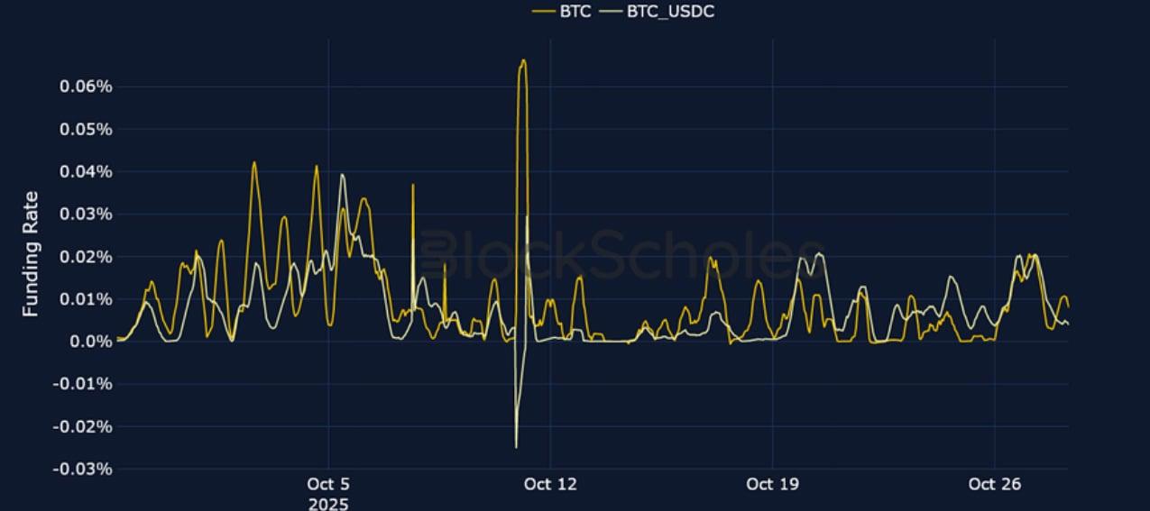 BTC FUNDING RATE – Perpetual swap funding rates show a slight preference for leveraged upside exposure, matching the similarly modest skew seen in short-tenor BTC volatility smiles.