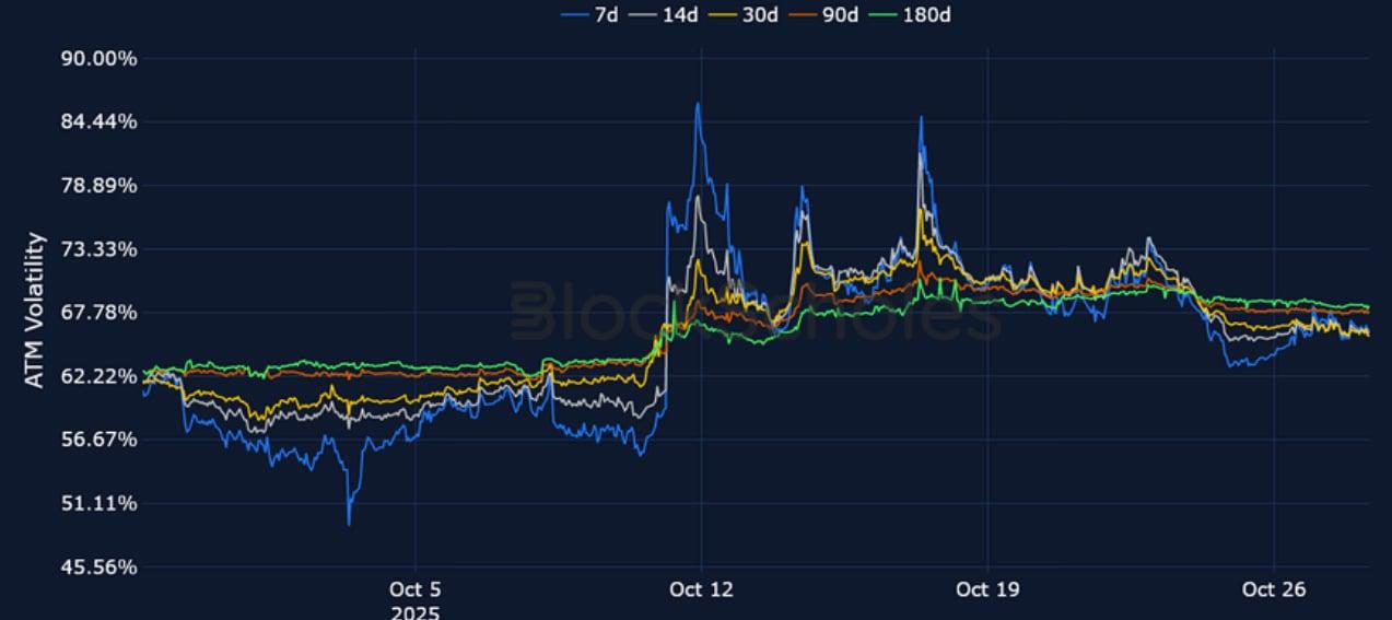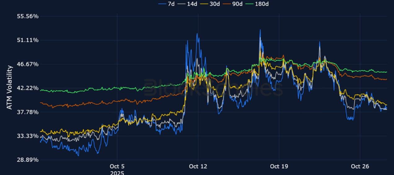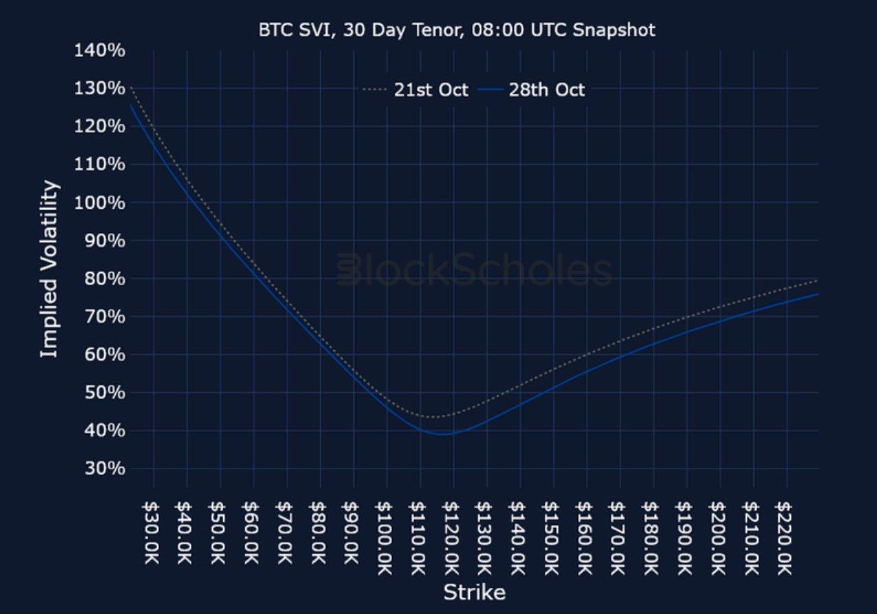 BTC SVI ATM IMPLIED VOLATILITY – Demand for optionality still remains elevated above pre-October 10 levels where ATM vol traded closer to 30%.