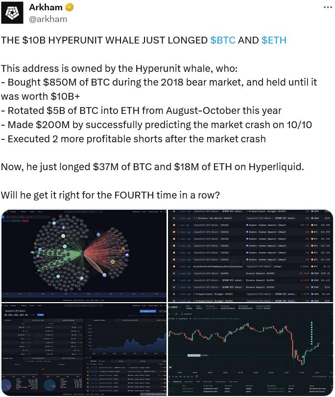 HyperUnit, the whale that made $200 million from the US-China tariff war last month, is now betting on a recovery in Bitcoin and Ether, opening $55 million in long positions.