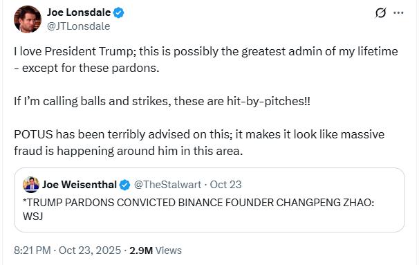 The issue is even more serious in Zhao's pardon case. Binance, which is said to still be majority-owned by Zhao, is said to be a significant investor in Trump's cryptocurrency project World Liberty Financial. According to the New Yorker, the exchange has lobbied lawyers close to Trump for a pardon. Palantir co-founder JOE Lonsdale said: