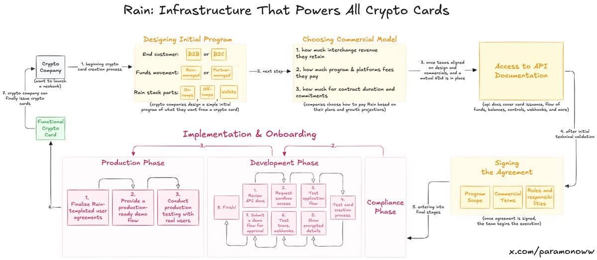 You might not know this, but half of your favorite crypto cards are probably backed by @raincards . Rain is one of the most fundamental protocols in neobank's system, as it handles virtually all the technical support behind crypto cards. All those crypto card companies do is put their own brand logo on the card (it sounds harsh, but that's the truth).