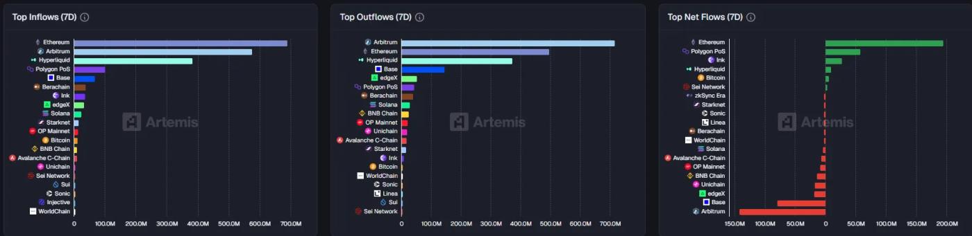 This week saw the largest increase in USDT issuance, while USDC experienced a significant outflow, and funds continued to withdraw substantially from CEXs, indicating that the short-term market liquidity remains tight. Regarding DeFi bridging asset flows, the ETH chain saw the largest net inflow, while the ARB chain experienced the largest outflow, resulting in relatively small overall fund flows and a rapid narrowing of market volatility.