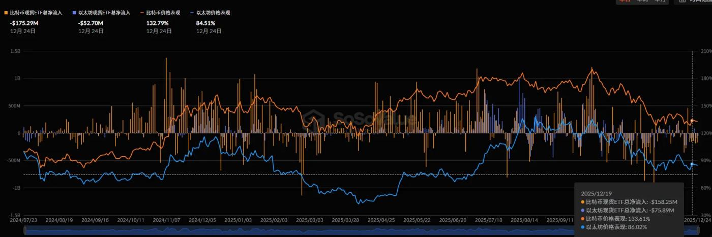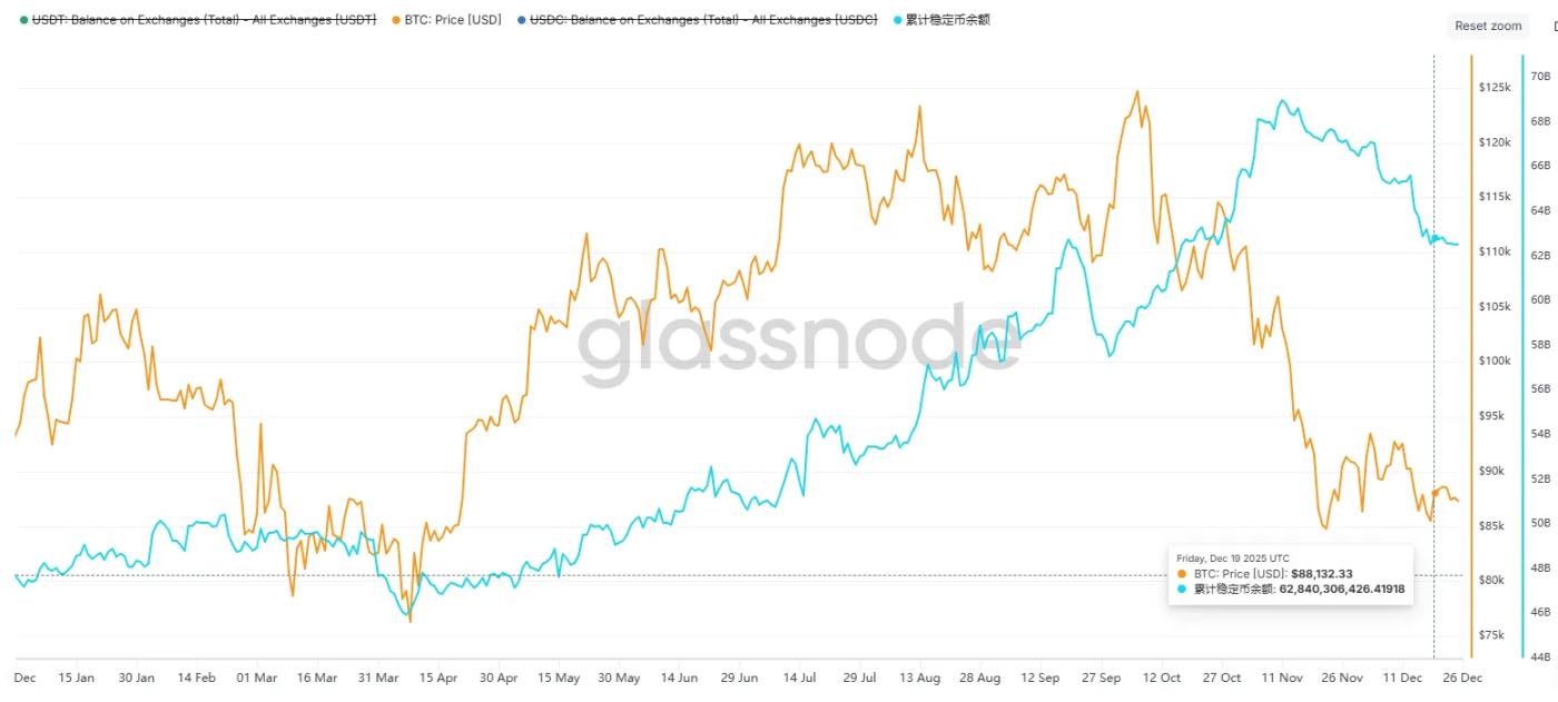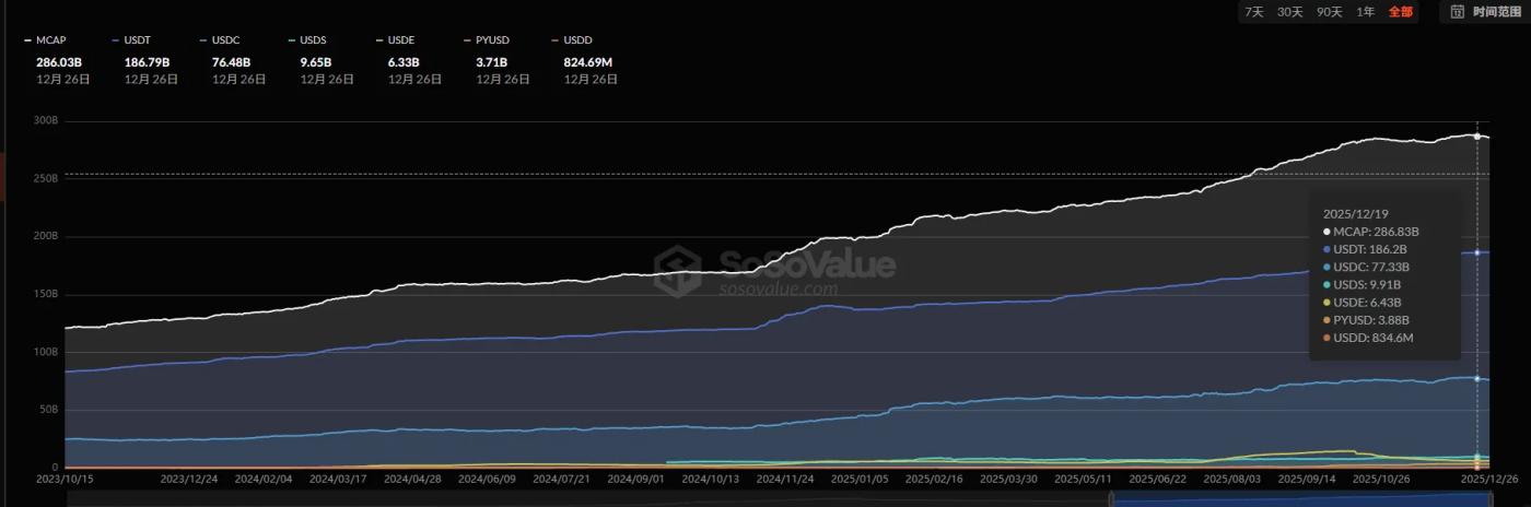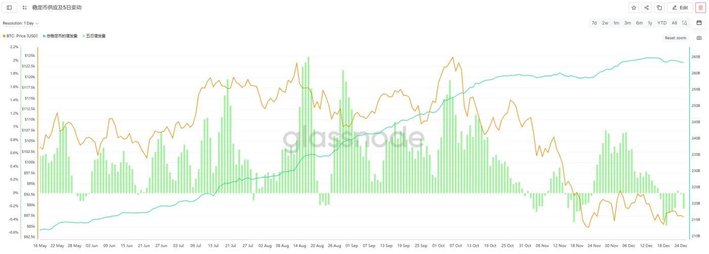 This week (December 20-26), the weekly issuance of stablecoins was -$326 million, continuing the outflow trend, but the scale of the outflow narrowed significantly. Compared to last week's negative issuance of $824 million, the daily average negative issuance this week fell from -$117.7 million to -$46.5 million, with overall fund flow increasing by 60% week-on-week. The overall market was mainly volatile this week, without a sustained decline, which corroborates the weakening trend of stablecoin outflows.