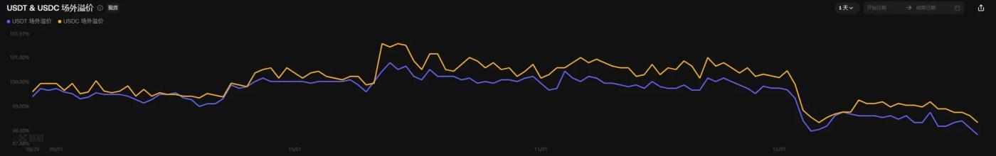 The over-the-counter (OTC) premium/discount for USDT and USDC declined slightly this week. Currently, USDT's premium/discount is 97.86%, and USDC's is 98.36%, both at relatively low levels for the year. This reflects continued weak market sentiment, insufficient willingness of OTC funds to buy the dips, and signs of capital outflow.