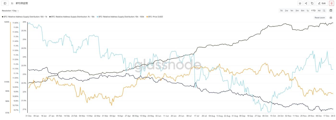 Looking at the percentage of Bitcoin holding addresses, the percentage of addresses holding 100-1K BTC rose from 25.813% to 25.951% this week, showing a slight increase in holdings; the percentage of addresses holding 10K-100K BTC fell from 11.341% to 11.146%, indicating some reduction in holdings; and the percentage of addresses holding 1K-10K BTC rose slightly from 20.972% to 21.022%, showing an overall slight fluctuation.