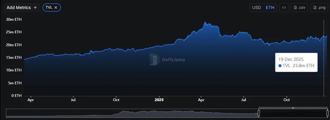 Total on-chain TVL reached $117.5 billion, a 1.29% increase month-over-month, showing an overall volatile trend. ETH staking volume remained stable, exhibiting a fluctuating upward trend, reflecting relatively solid confidence among long-term holders.