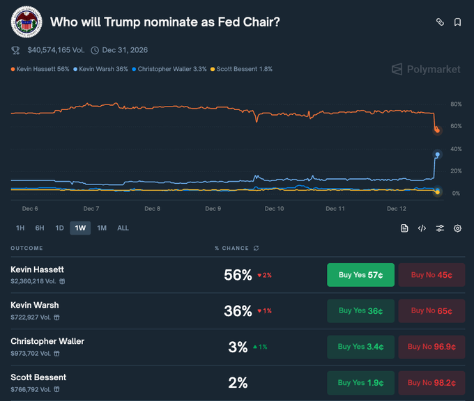 Just In: Kevin Warsh is up to 36% chance to be the next Fed Chair on Polymarket His odds were just 13% yesterday