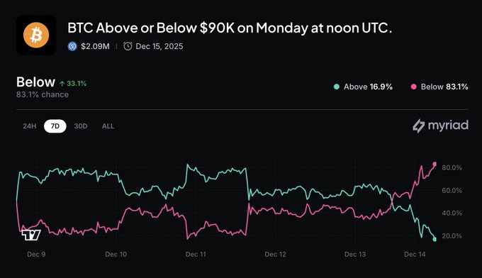 Crazy moves in the Myriad BTC above or below $90k market resolving tomorrow Below $90k is now a heavy favorite at 83%, after being an underdog for most of the market's existence And with over $2M wagered on this one...