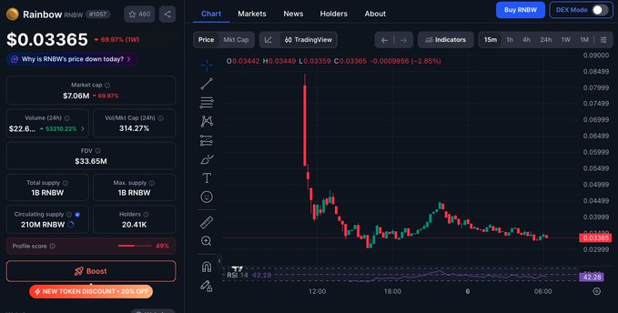 The Rainbow Wallet RNBW token has settled at a $34M fdv in its first day of trading