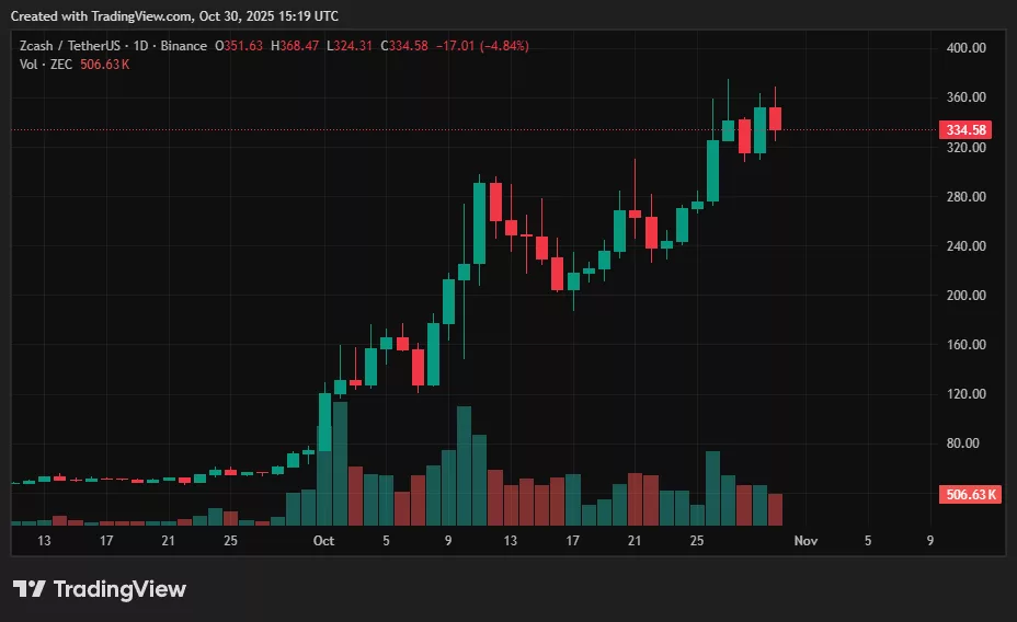 Zcash (ZEC) 在经历了 2025 年最强劲的涨势之一后,继续主导着加密货币市场的讨论。该代币交易价格约为 335 美元,过去一周上涨超过 40%,一个月内上涨超过 400%。随着监控日益普及,投资者重新审视隐私币的概念,Zcash 也随之走红。
