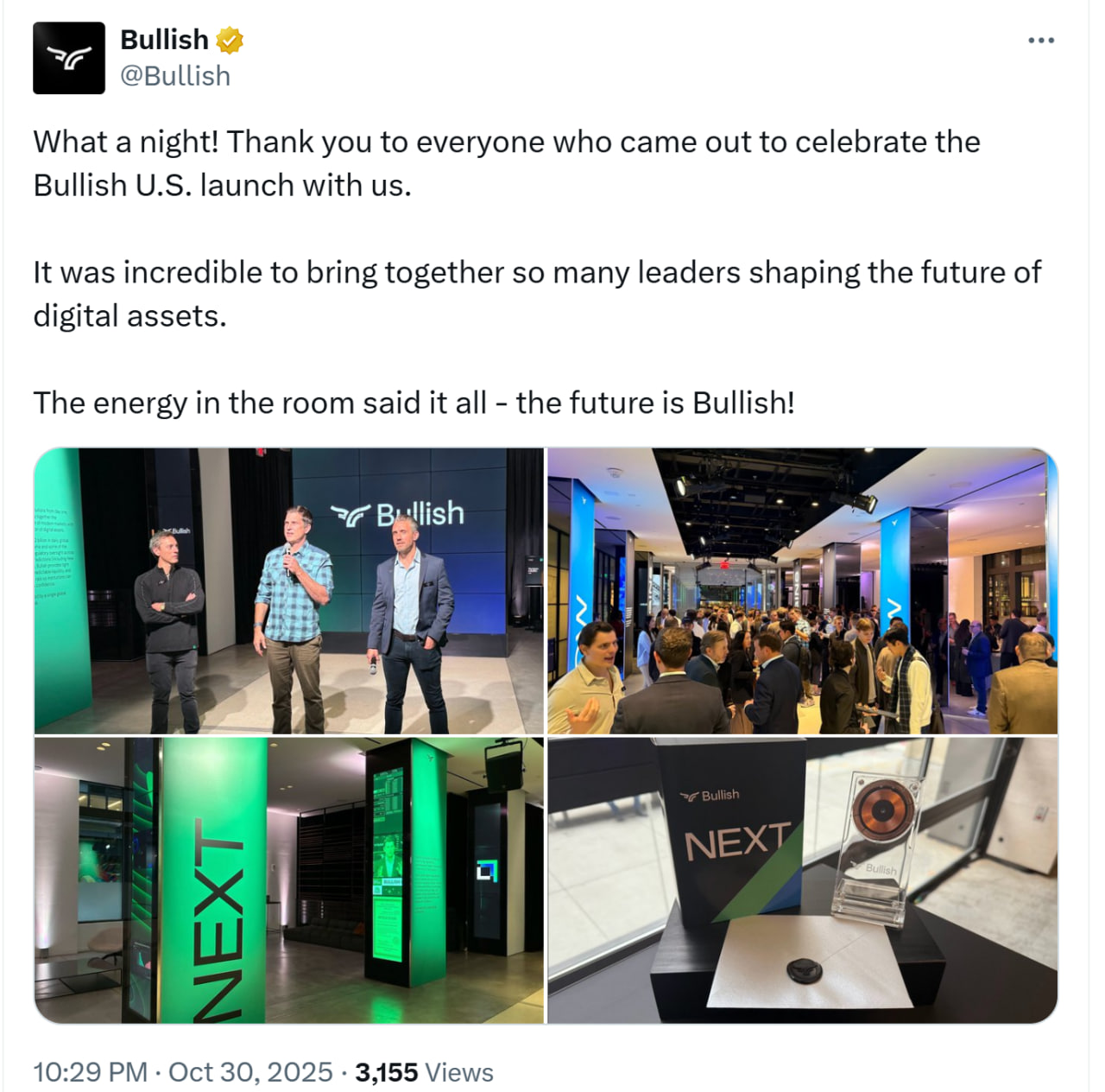 此次收购恰逢Bullish在纽约举行美国发布会,该公司在会上汇聚了众多数字资产领域的领军人物,共同庆祝其业务扩张。“现场气氛说明了一切——未来一片光明,”该公司在会后于X平台上发文表示。