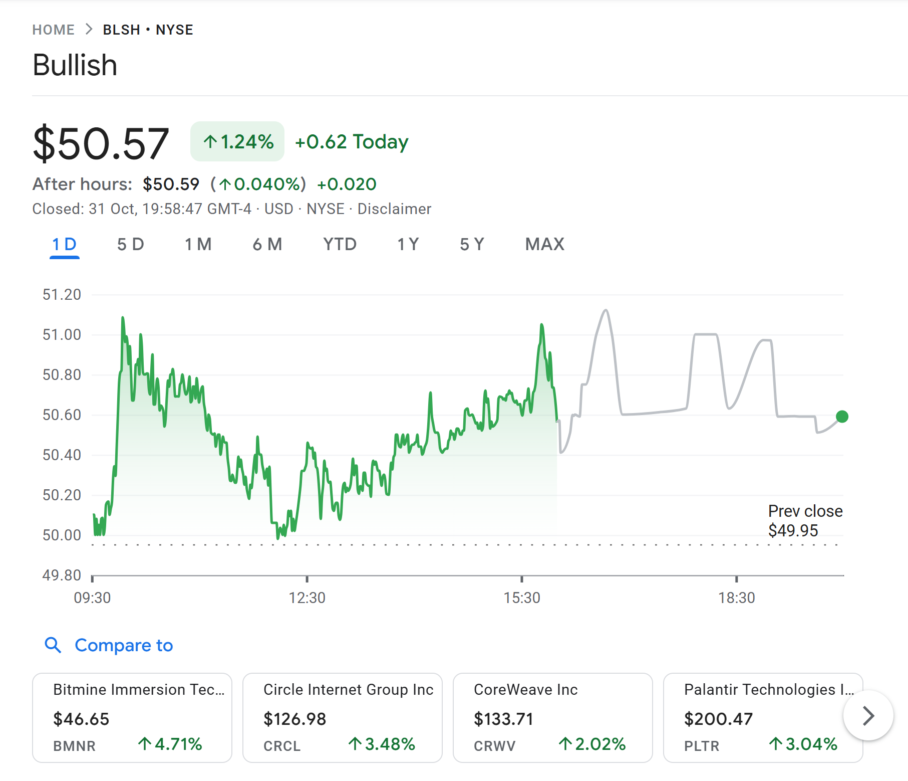 周五,看涨股票上涨1.24%,收于50.57美元,从早前的市场波动中收复失地。该交易所由Block.one支持,首席执行官为汤姆·法利。