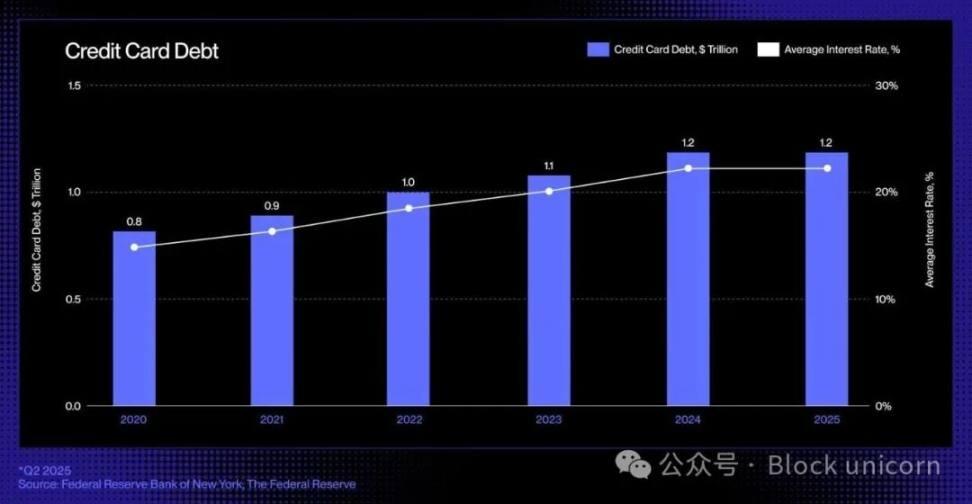 在美国,最主要的无担保借贷形式是信用卡:这种无处不在、流动性强且即时可用的信贷工具允许消费者在购物时无需提供抵押品即可借款。信用卡未偿债务持续增长,目前已达到约 1.21 万亿美元。